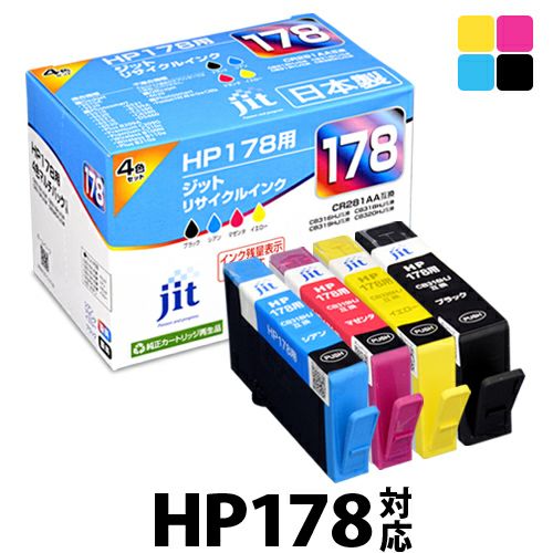 商品詳細 | ヒューレットパッカード HP HP178 CR281AA 4色マルチパック対応 ジットリサイクルインクカートリッジ 【JIT-H1784P】。ジットのリサイクルインクカートリッジはプリンタ本体保証と万全のサポート付きで安心。日本製。3,500円以上送料無料&平日15時まで最短即日発送。 【適合プリンタ】 Deskjet 3070A / Deskjet 3520 / Photosmart 5510 / Photosmart 5520 / Photosmart 5521 / Photosmart 6510 / Photosmart 6520 / Photosmart 6521 / Photosmart B109A / Photosmart C5380 / Photosmart C6380 / Photosmart D5460 / Photosmart Plus B209A / Photosmart Plus B210a / Photosmart Premium C309G / Photosmart Premium C310c / Photosmart Wireless B109N / Photosmart Wireless B110a