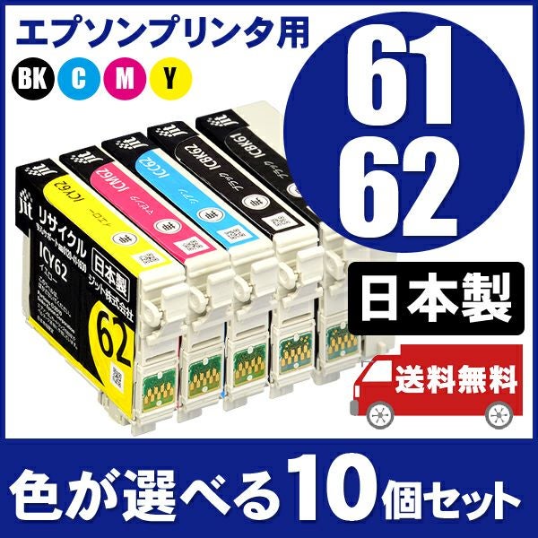 商品詳細 | まとめ買い≪色が選べる10本セット≫EPSON IC61/62シリーズ リサイクルインクカートリッジ(ICBK61、ICC62、ICM62、ICY62)対応(エプソン)。ジットのリサイクルインクカートリッジはプリンタ本体保証と万全のサポート付きで安心。日本製。3,500円以上送料無料&平日15時まで最短即日発送。
