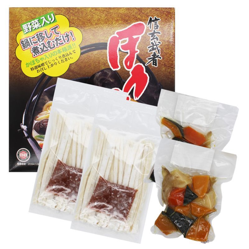 この1箱に4人前(2人前×2)入りです。めん、みそ、野菜が入っている優れもの。かぼちゃ、じゃがいも、人参、ごぼう入りの本格味!あとは、鍋に移して煮込むだけ!2袋づつ分かれてますので2人前を2回に分けても使えます。