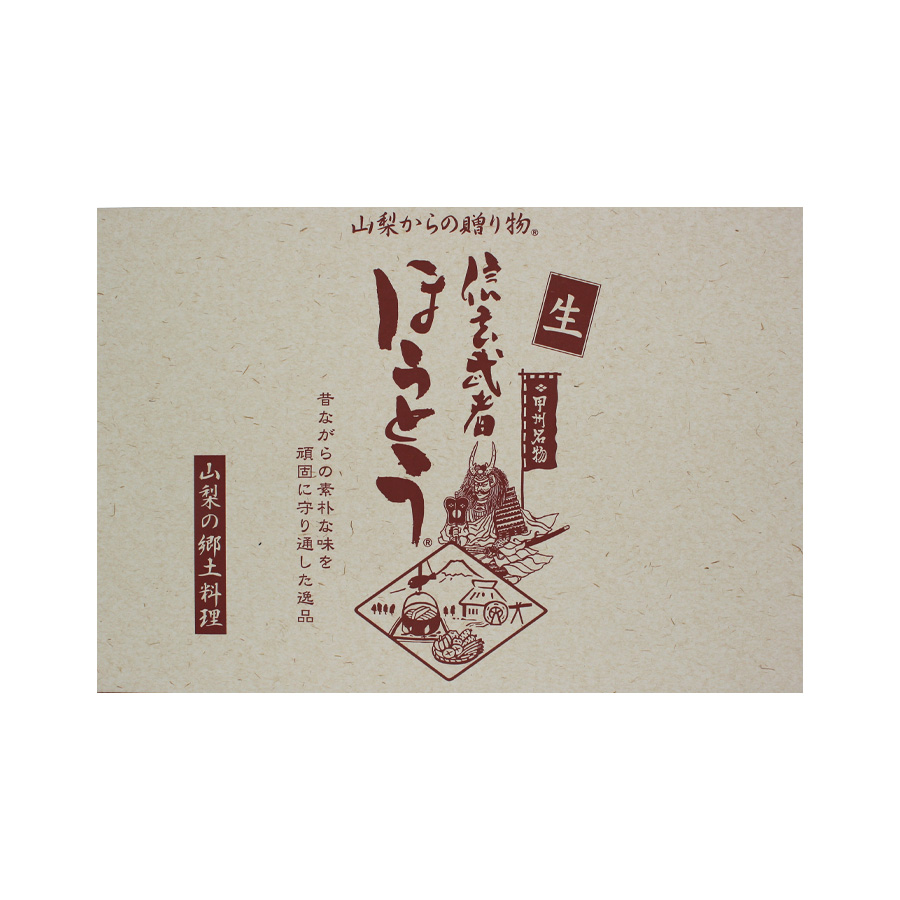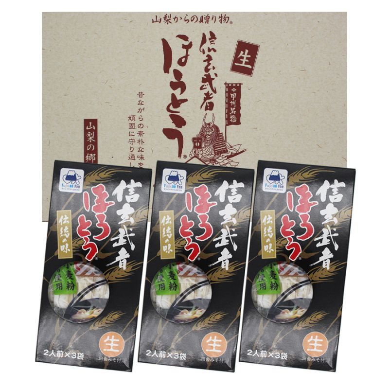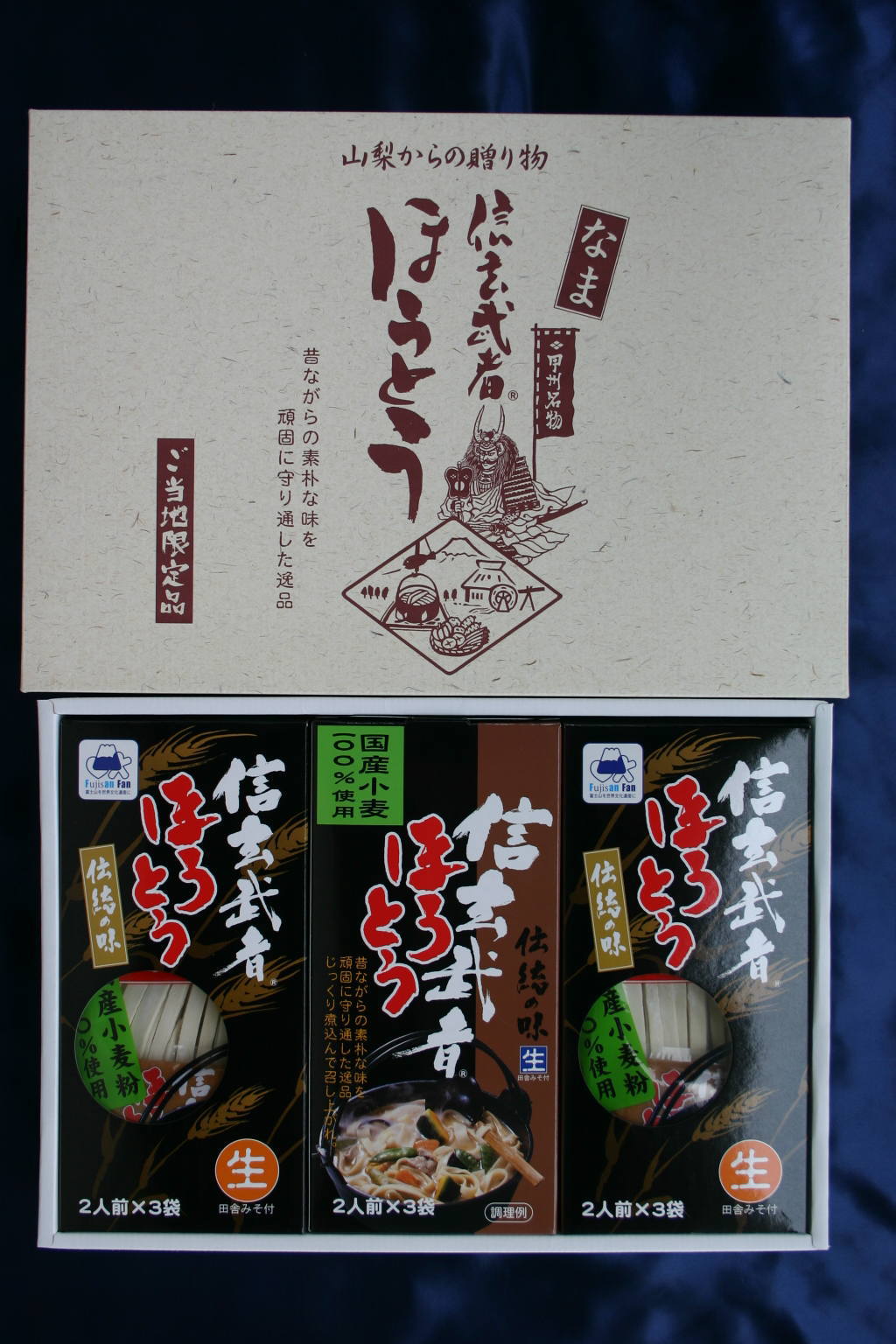 定番のほうとうの2人前を3袋入れた手提げ箱3箱をセットにしてギフト用の箱に入れました。2人前が3袋づつ入っていますので、大人数でも、2人前を3回に分けても、3種類の味をお楽しみいただけます。