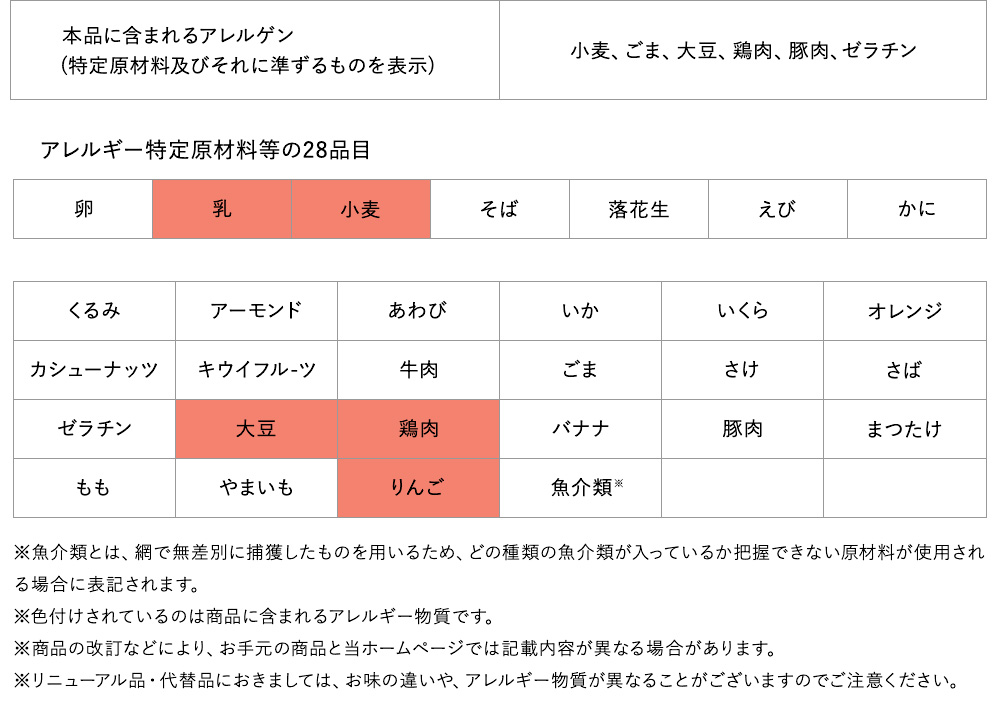 めん(小麦粉(国内製造)、食塩/加工でん粉、酒精、トレハロース)、トマトスープ(トマトペースト、トマトピューレー、味噌、砂糖、植物油、食塩、チキンエキス、おろしにんにく、醸造酢、たまねぎエキス、酵母エキス、香辛料/調味料(アミノ酸等)、パプリカ色素)
