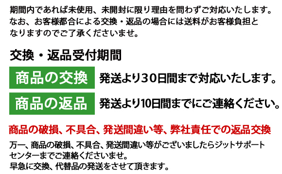 お客さまより当店へご連絡 ※ご連絡がない交換はお受けできかねますので必ずご連絡をお願いいたします。 サポートセンター:03-5812-4584(平日9:30~17:00) お問い合わせメール:jitstore@jit-c.co.jp ※メールでのご連絡の場合必ず、お名前、注文番号、交換の理由、交換したい型番をお書きの上ご送信をお願いいたします。 | | ↓ | お客様より交換商品を弊社下記住所にご送付していただきます。※片道分の送料はお客様のご負担でお願いいたします。