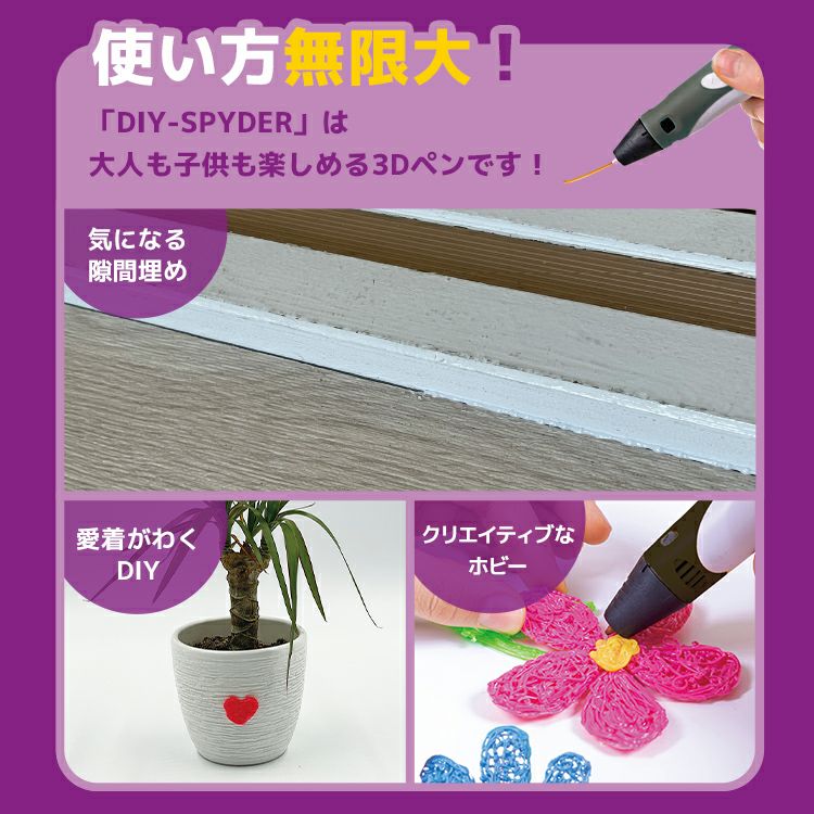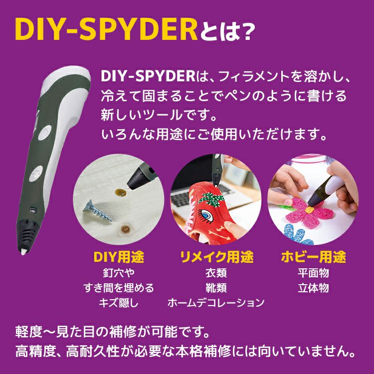 他の画像を見る 3Dペン型DIY・補修ツール DIY-SPYDER (DIY-スパイダー) 立体 アートペン フィラメント デコレーション フィギュア DIY 工作 立体絵画 当店通常価格 ¥ 3,289 税込 在庫切れ 詳細を見る お気に入りに登録する