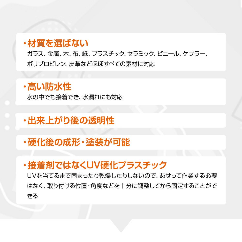 他の画像を見る 日本製の紫外線硬化液体プラスチック誕生!修理、修繕、成型がこれ1本 紫外線4秒照射で硬化 プラモデル 手芸 コード パーツ復元 溶接 30ml 選べる ノズル ハケ UV Bondy MEGA (ユーブイ ボンディ メガ) 液体プラスチック 接着剤 溶接機 スターターキット30ml 大容量 LED(UV) 紫外線ライト 選べる2タイプ ノズル ハケ【送料無料】 当店通常価格 ¥ 4,378 税込 詳細を見る お気に入りに登録する